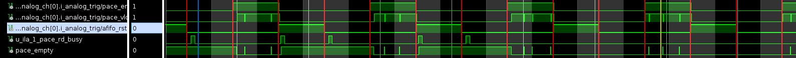 The screenshot below was taken from a failure on the field: the rd_busy and empty signals are seen asserting for three reset cycles, and then the FIFO starts misbehaving and they stop asserting on the last two resets. This condition was very hard to spot and diagnose as it happened sporadically once in about 30 reset cycles.
