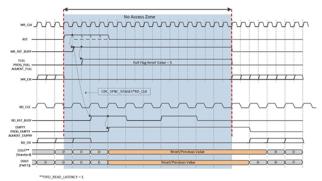 I learned the hard way that the reset sequence is particularly sensitive to active control signals, such as rd_en and wr_en. If these control signals were active during reset, the FIFO would misbehave sporadically, for example, not going empty on reset and the rst_busy signals never asserting after a while.